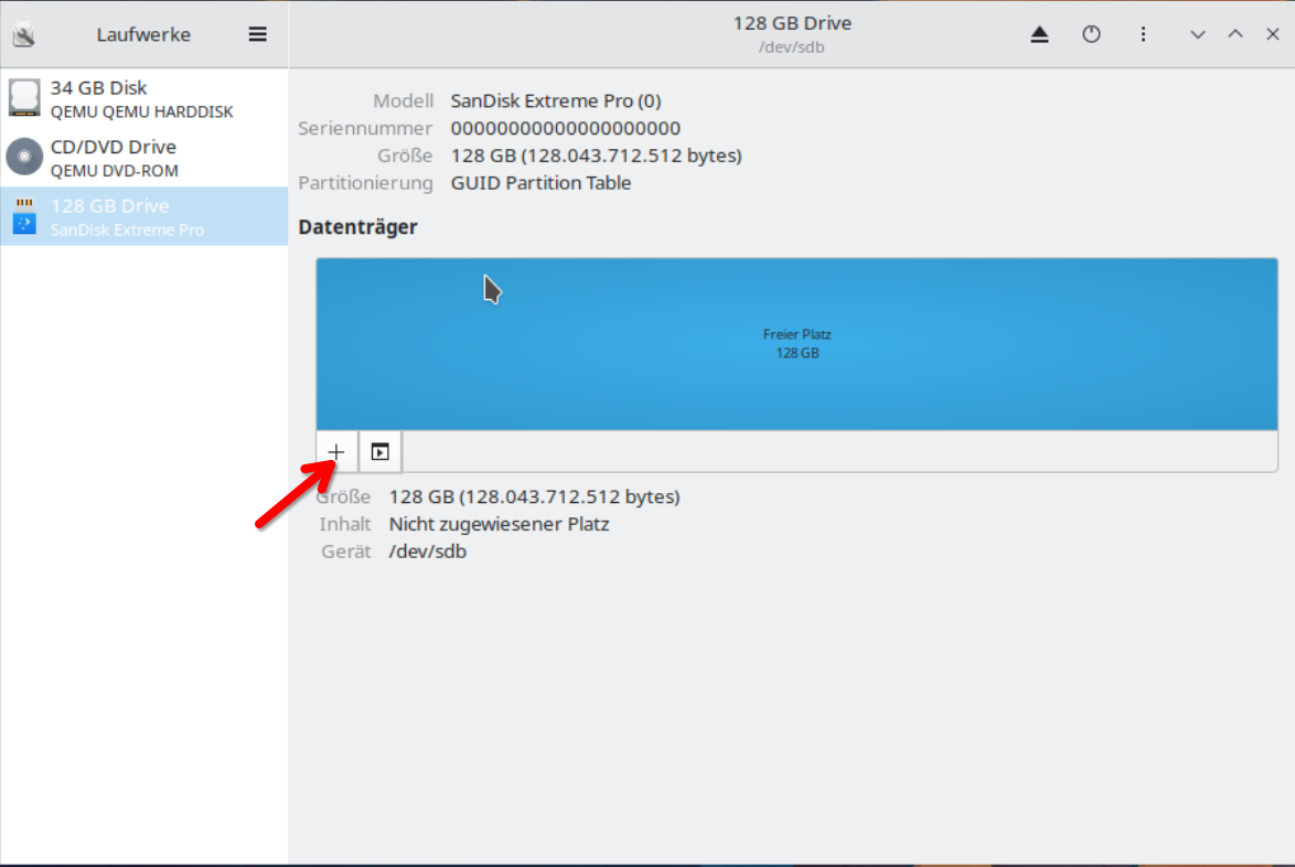 Leider ist die Übersetzung hier nicht ganz richtig. Da an diesem Punkt noch nicht formatiert wurde, sondern lediglich eine neue Partitionstabelle angelegt wurde. Um nun tatsächlich zu formatieren klickst du nun auf das Kleine „Plus“ und auf „Weiter“.