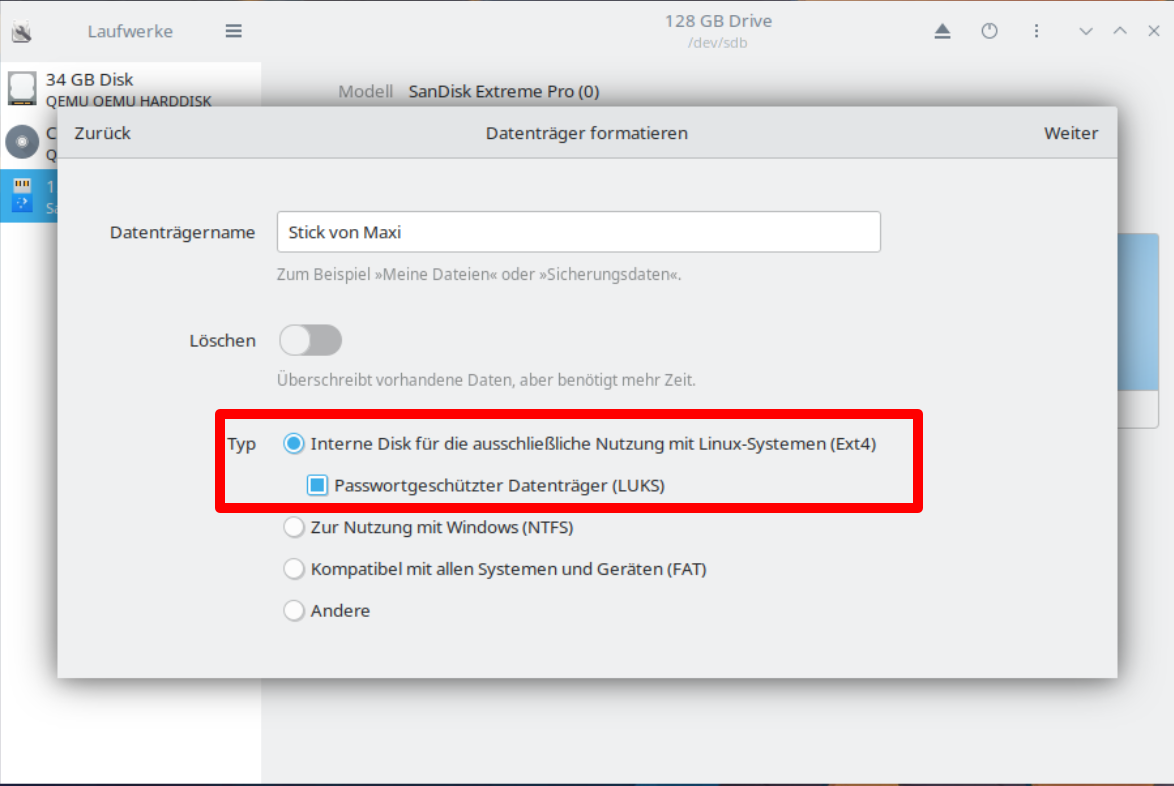 Du könnest aber den Typ auf „nur Linuxsysteme“ beschränken und den Stick zusätzlich verschlüsseln um die Daten vor Diebstahl zu schützen. Beim Klick auf „Weiter“ würdest du dann noch um eine Passphrase gefragt werden.