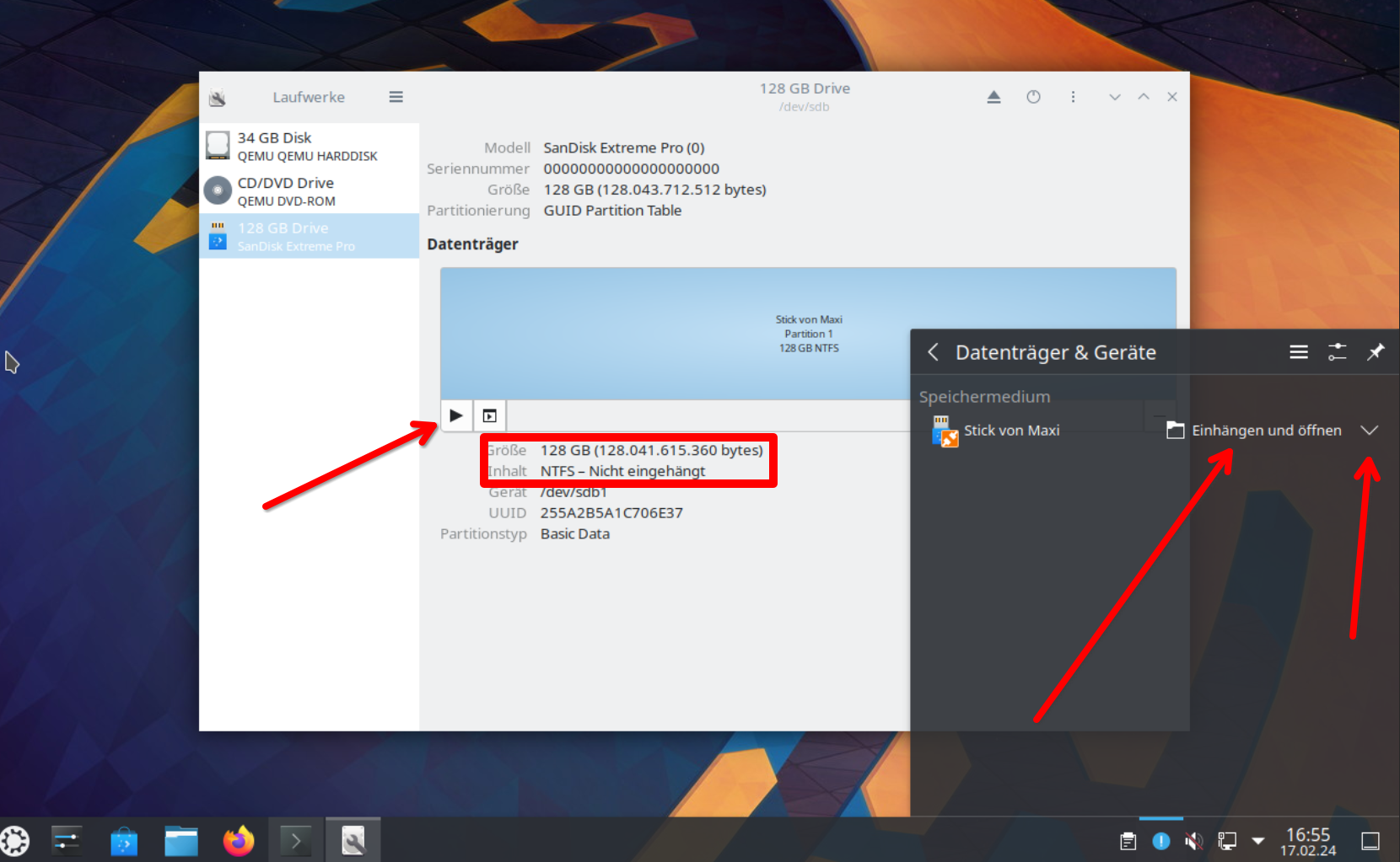 Zum Formatieren von Datenträgern z.B. USB-Sticks ist die Laufwerksverwaltung (Disks) zuständig. Diese kannst du direkt aus dem KDE-Startmenü links unten aufrufen in dem du das Startmenü anklickst und einfach drauf losschreibst.