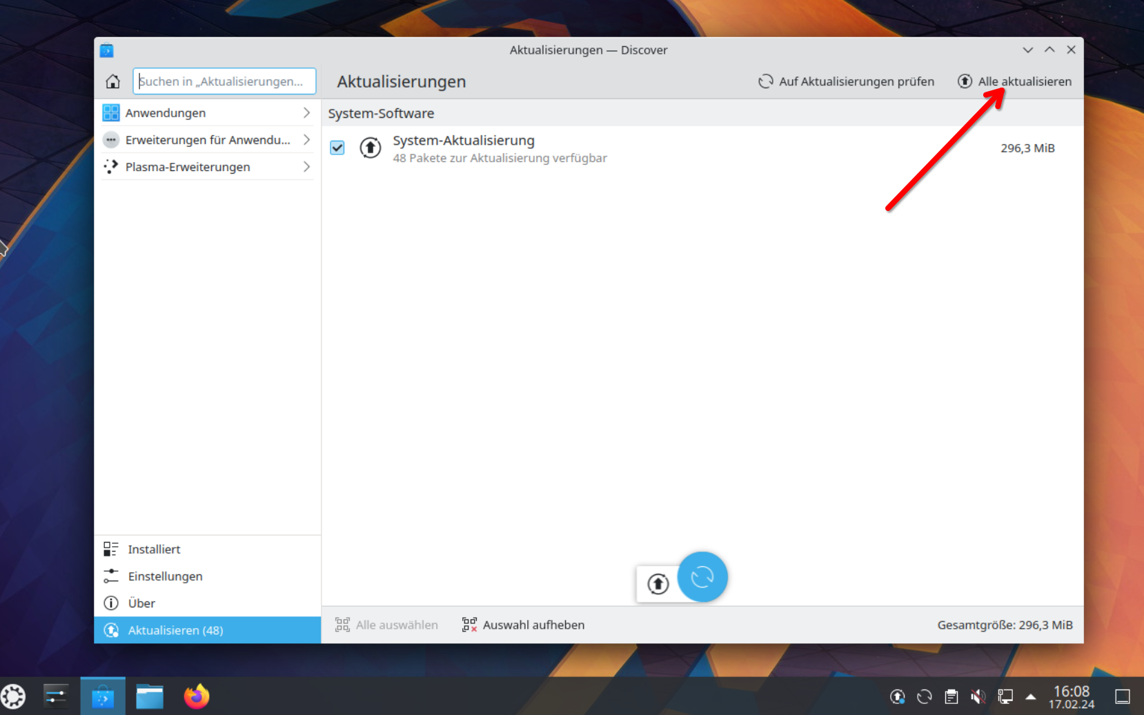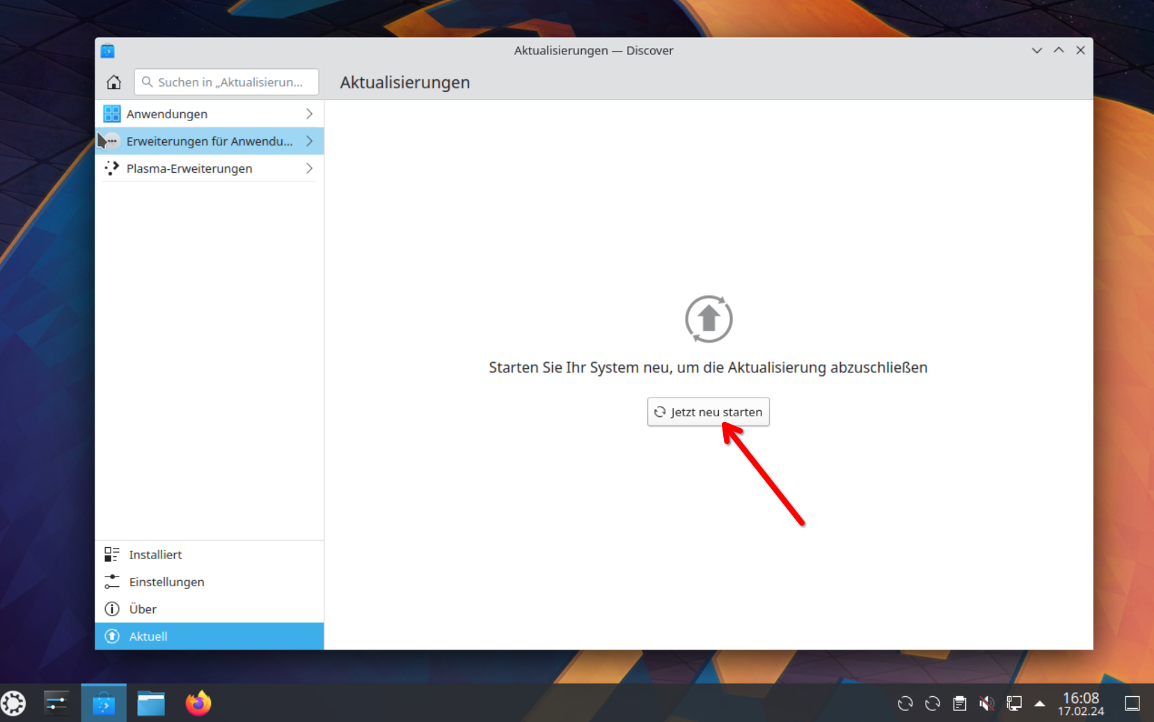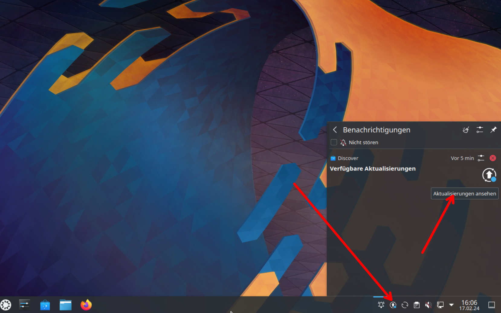 Im nächsten Schritt klickst du nun auf „Aktualisierungen ansehen“, damit öffnet sich Discover und du kannst deine Systemaktualisierungen anstoßen.