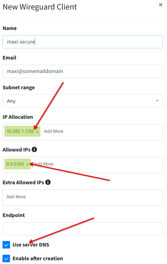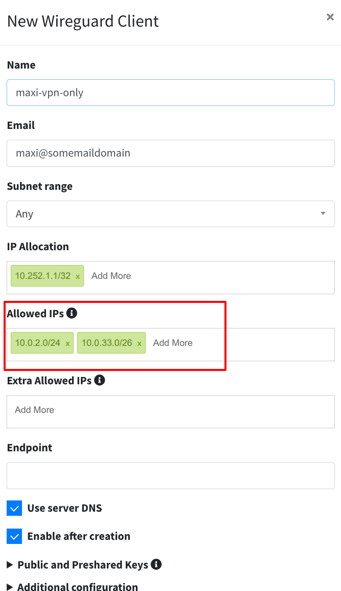 IP Allocation ist die IP des Client am Endpunkt, also z.B. das Handy oder das Notebook. Achte darauf wenn du mehrere Wireguard-Server betreibst und Verbindungen zur gleichen Zeit verwenden möchtest, das du hier jeweils differente Netze verwendest.